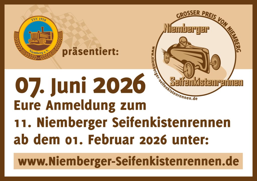 Vom 1. Februar bis 29. Mai 2026 ist die Anmeldung für die Rennteams möglich. Fangt rechtzeitig an, die Seifenkisten fit zu machen für das 11. Niemberger Seifenkistenrennen! Dafür wünschen wir viel Erfolg!