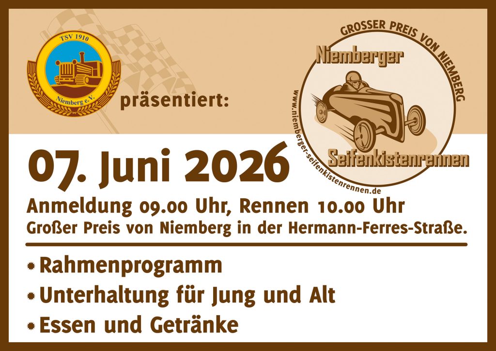Am Sonntag, 07. Juni 2026, wird 10 Uhr der Startschuss in der Hermann-Ferres-Straße für den 11. Großen Preis von Niemberg, das traditionelle Seifenkistenrennen, fallen und nach den Bobbycars gehen Junioren und Experten in 4 Wertungsläufen auf die Rampe.